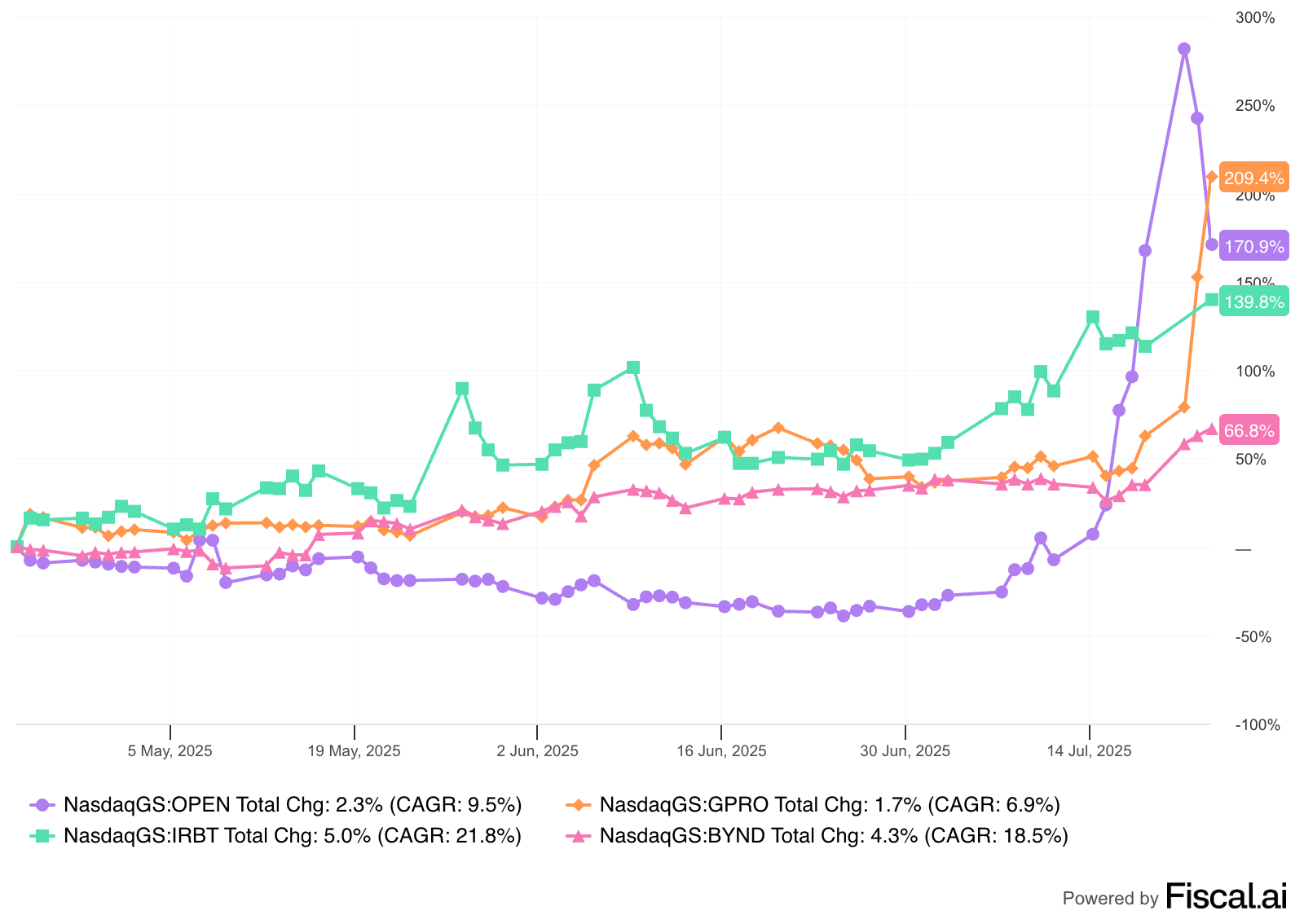 In this case, the market sees dead people – or dead stocks. Or stocks that if they’re not now completely dead, are likely to be. Picking four of the most absurd randomly: Open Technologies $OPEN, GoPro $GPRO, iRobot $IRBT and Beyond Meat $BYND. This is a three-month chart....